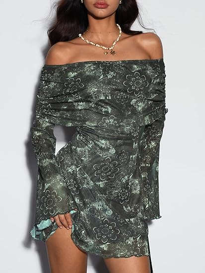 Women's 70s Vintage Floral Off The Shoulder Dress Foldover Long Sleeve Bodycon Mini Dress